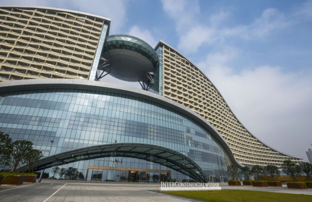 以“水”爲設計主題的武漢洲際酒店(diàn),其柔美的曲線建築形态将水的剛柔并濟與周邊國際博覽新城環形分(fēn)布的12個矩形展館完美交融,盡顯磅礴氣勢,成爲武漢漢陽新區的耀眼地标
