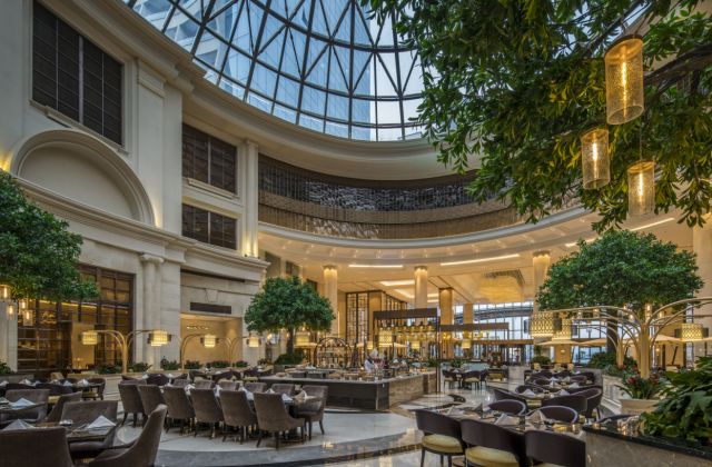 園林設計感十足的漢全日餐廳,頭頂玻璃蒼穹頂,自然光與燈光完美結合透過玻璃與室内空間感融爲一(yī)體(tǐ)。